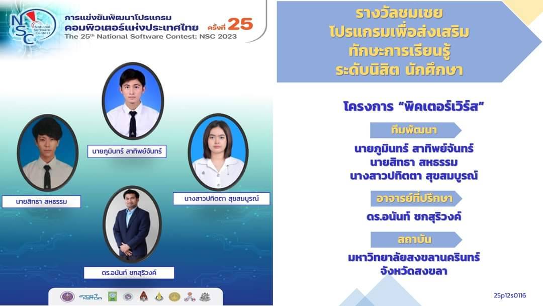 • รางวัลชมเชยน โปรแกรมเพื่อส่งเสริมทักษะการเรียนรู้ ระดับนิสิต นักศึกษา โครงการพิคเตอร์เวิร์ส