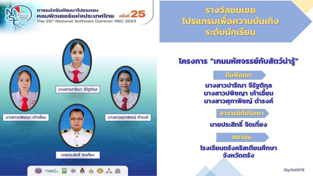 • รางวัลที่ 3 โปรแกรมเพื่องานการพัฒนาด้านวิทยาศาสตร์และเทคโนโลยี ระดับนิสิต นักศึกษา โครงการแผนที่ความเสี่ยงการเกิดเพลิงไหม้ในบริเวณป่าพรุควนเคร็งโดยใช้เทคนิคการเรียนรู้ของเครื่อง