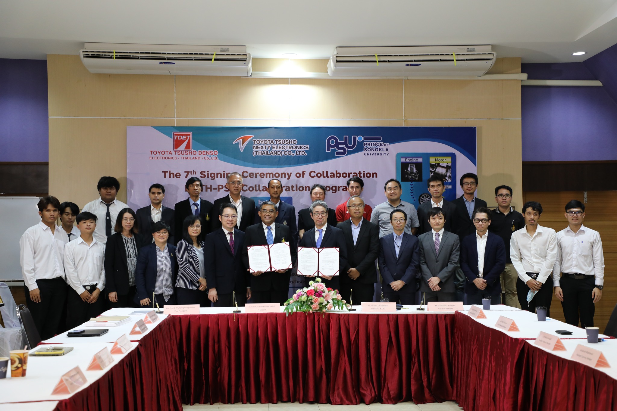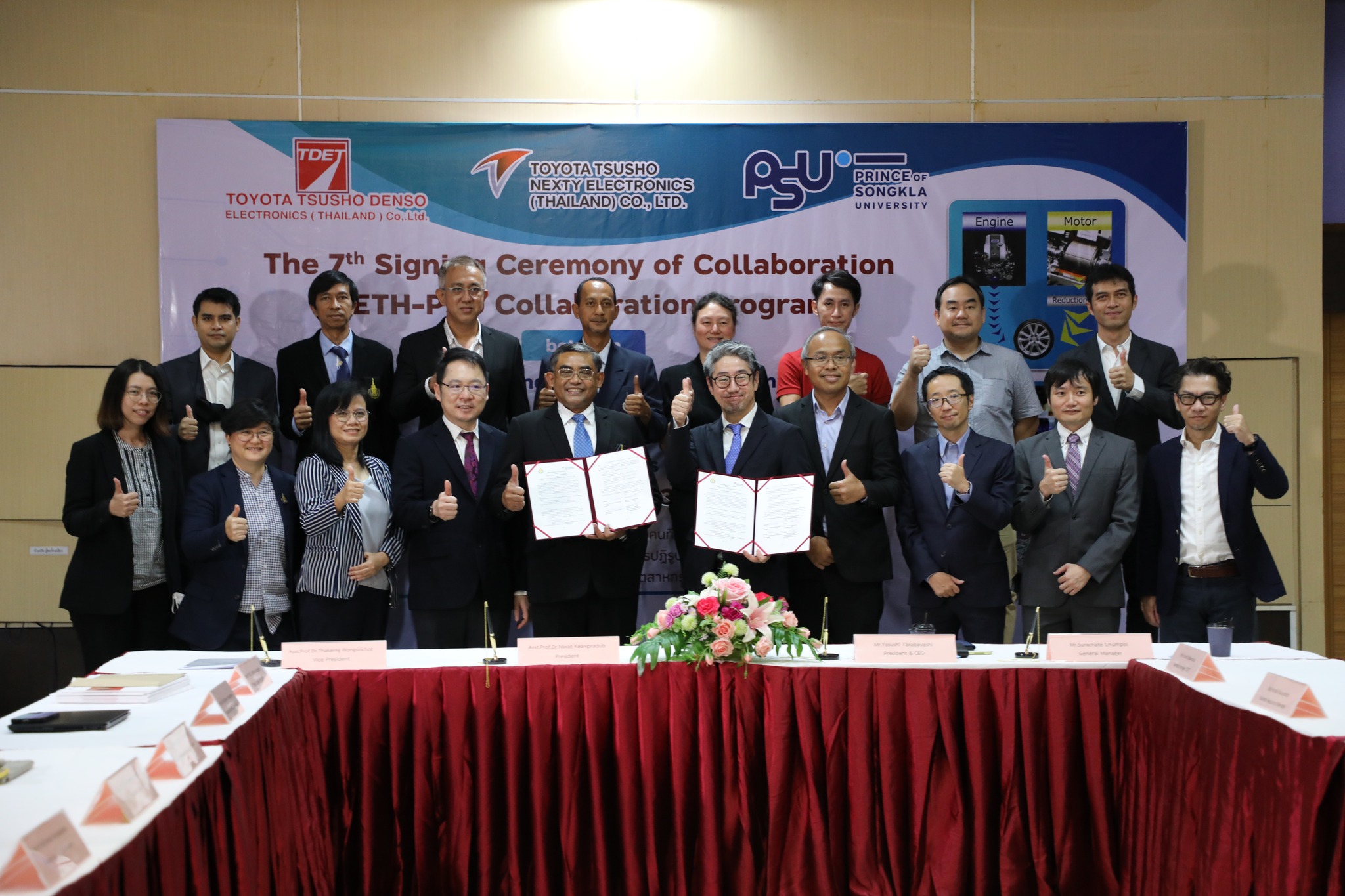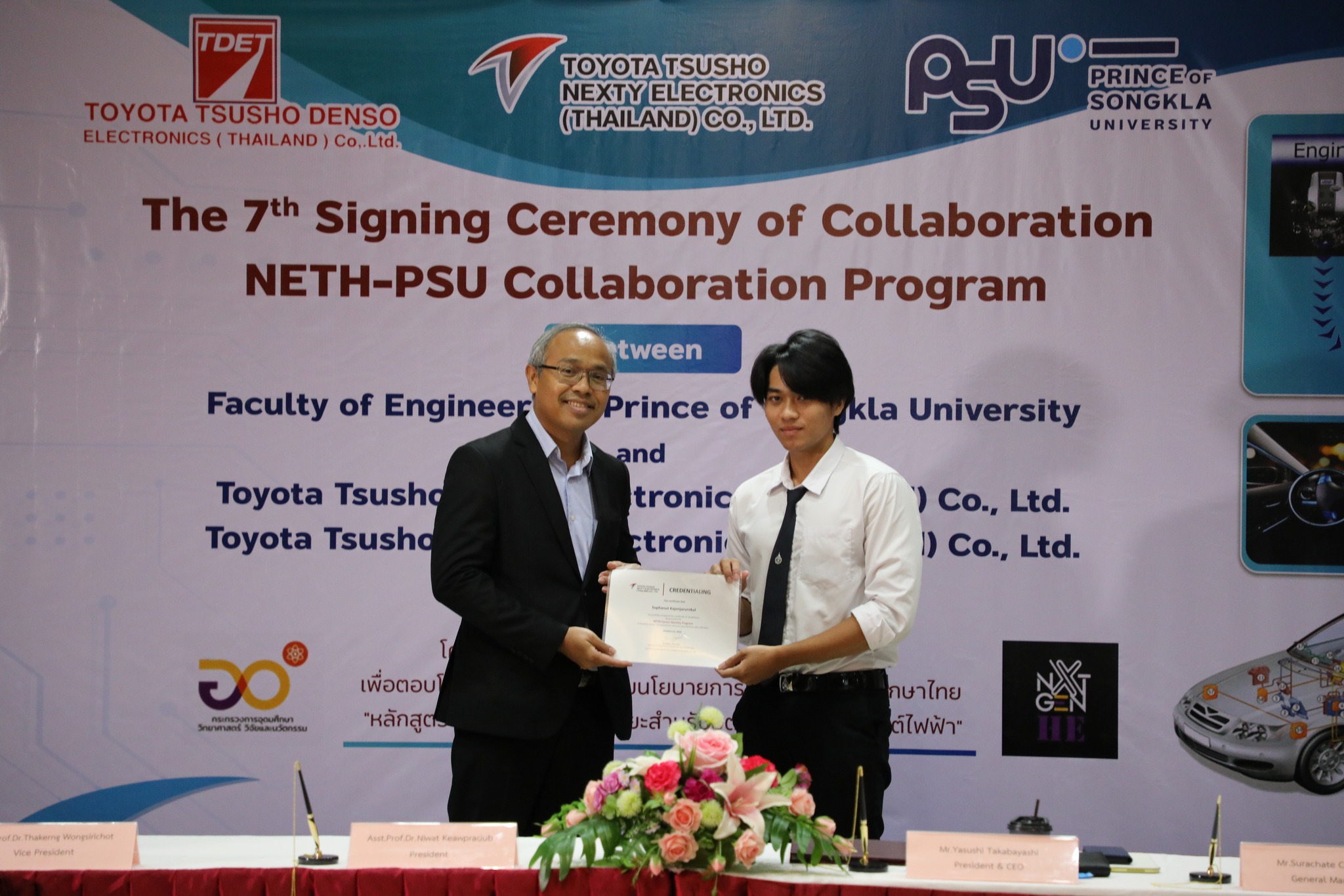 ผศ.ดร.นิวัติ แก้วประดับ อธิการบดีมหาวิทยาลัยสงขลานครินท์ และ Mr. Yasushi Takabayashi ประธานกรรมการผู้จัดการและซีอีโอ NETH ร่วมลงนาม MOU พร้อมด้วย Mr. Hiroshi Nakamura ซีอีโอ TDET คุณสุรเชษฐ์ ชุมพล ผู้จัดการทั่วไปแผนกพัฒนาซอฟต์แวร์ NETH โดยมี รศ.ดร.ณัฎฐา จินดาเพ็ชร์ หัวหน้าโครงการผลิตบัณฑิตพันธุ์ใหม่ “อิเล็กทรอนิกส์อัจฉริยะสําหรับอุตสาหกรรมยานยนต์ไฟฟ้า” และคุณโกสินทร์ พัตรานนท์ วิศวกรอาวุโส  NETH ร่วมในพิธีและนำเสนอโครงการ