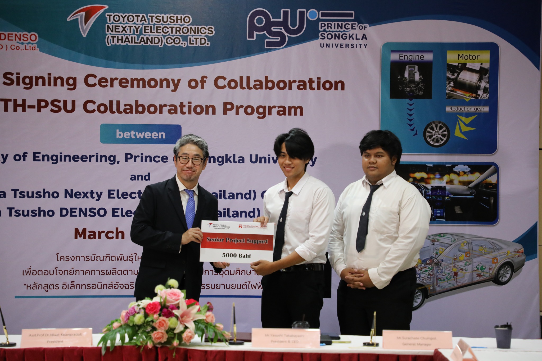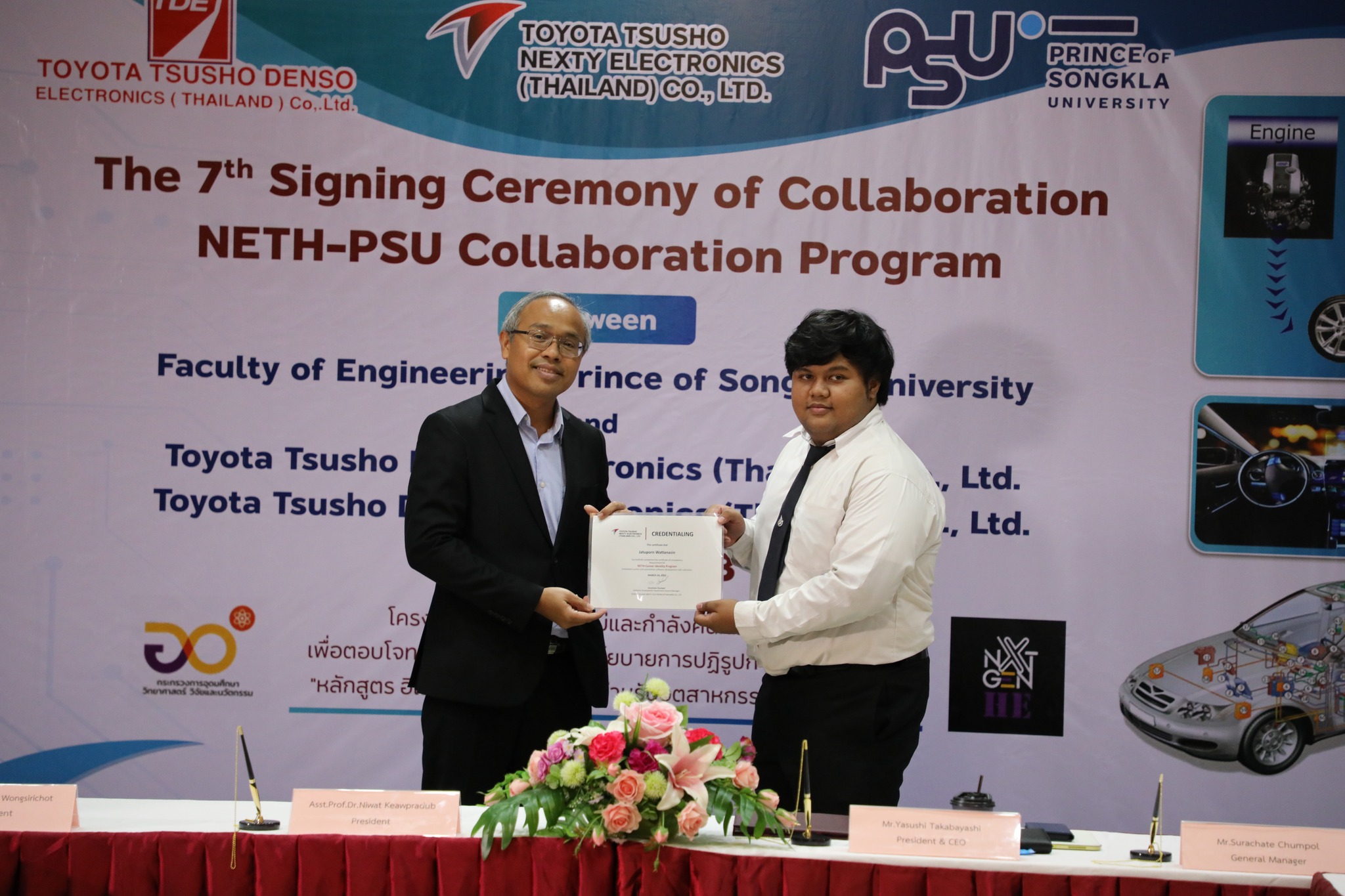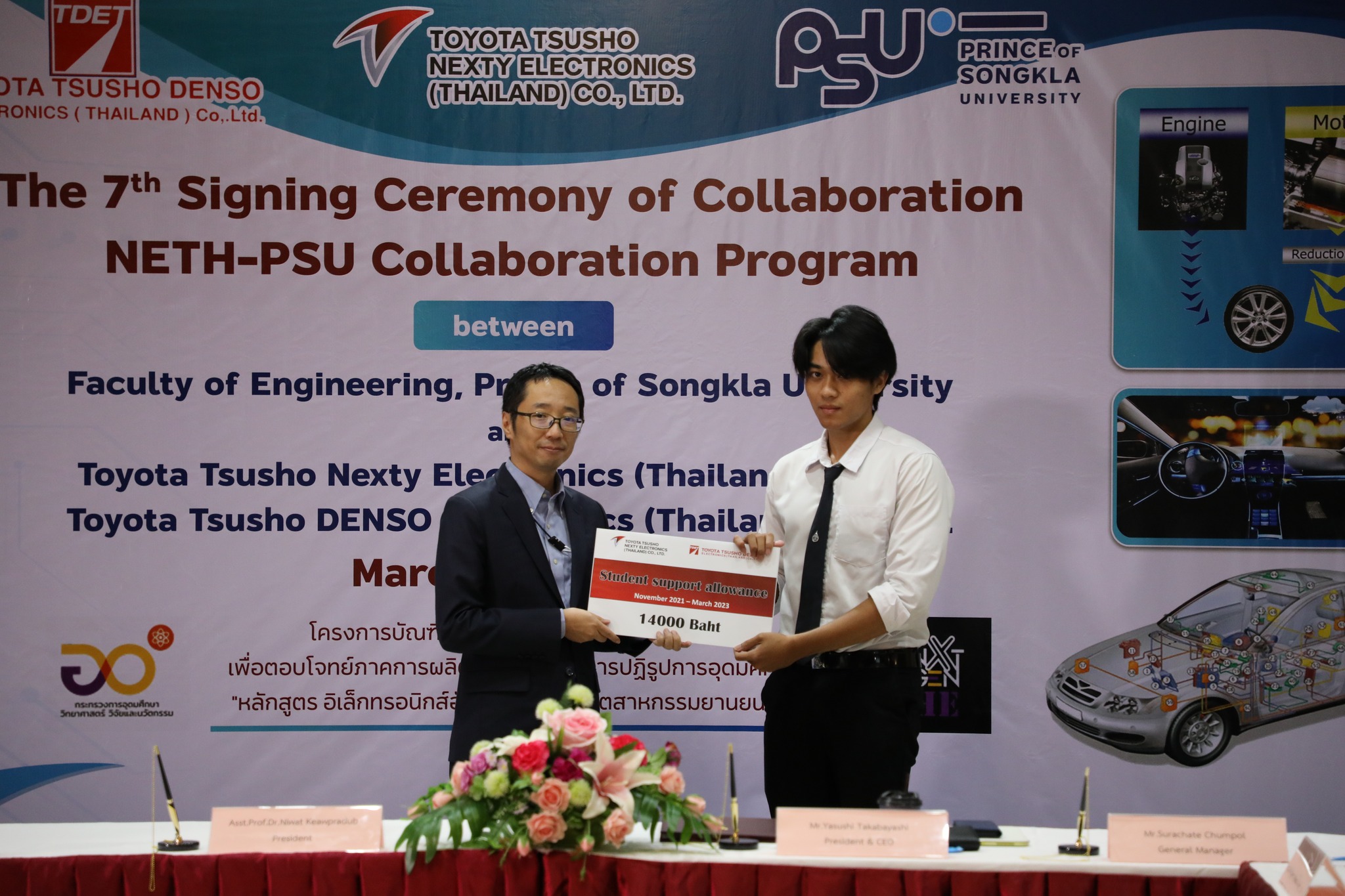 ผศ.ดร.นิวัติ แก้วประดับ อธิการบดีมหาวิทยาลัยสงขลานครินท์ และ Mr. Yasushi Takabayashi ประธานกรรมการผู้จัดการและซีอีโอ NETH ร่วมลงนาม MOU พร้อมด้วย Mr. Hiroshi Nakamura ซีอีโอ TDET คุณสุรเชษฐ์ ชุมพล ผู้จัดการทั่วไปแผนกพัฒนาซอฟต์แวร์ NETH โดยมี รศ.ดร.ณัฎฐา จินดาเพ็ชร์ หัวหน้าโครงการผลิตบัณฑิตพันธุ์ใหม่ “อิเล็กทรอนิกส์อัจฉริยะสําหรับอุตสาหกรรมยานยนต์ไฟฟ้า” และคุณโกสินทร์ พัตรานนท์ วิศวกรอาวุโส  NETH ร่วมในพิธีและนำเสนอโครงการ