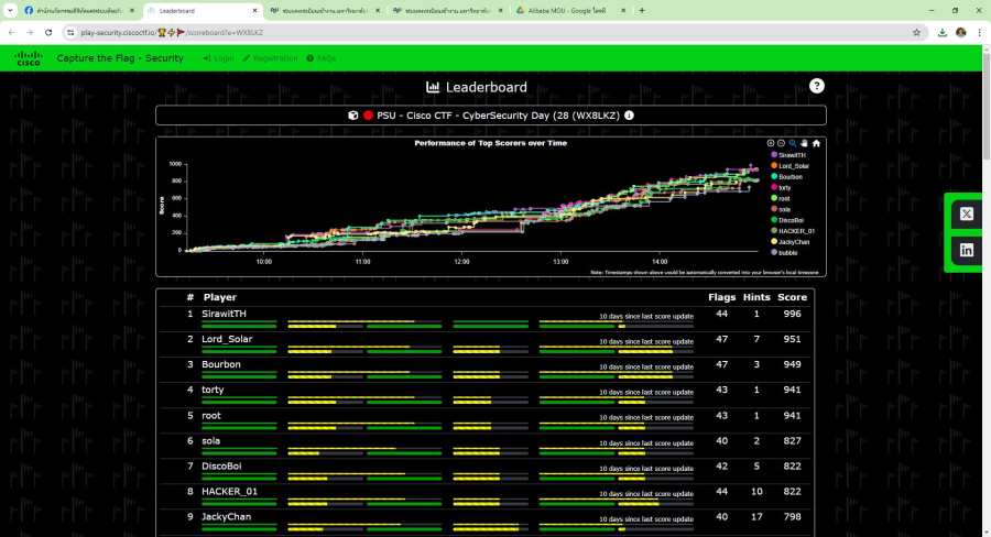 Workshop: ในรูปแบบการแข่งขัน Capture the Flag โดย CISCO ผู้เข้าร่วมอบรมจะได้ฝึกปฏิบัติการทำงานทั้งแบบ Red Team และ Blue Team โดย Lab Online จาก CISCO และร่วมลุ้นรางวัลจากการแข่งขันเก็บคะแนนชิงรางวัลการแข่งขันกำหนดการ