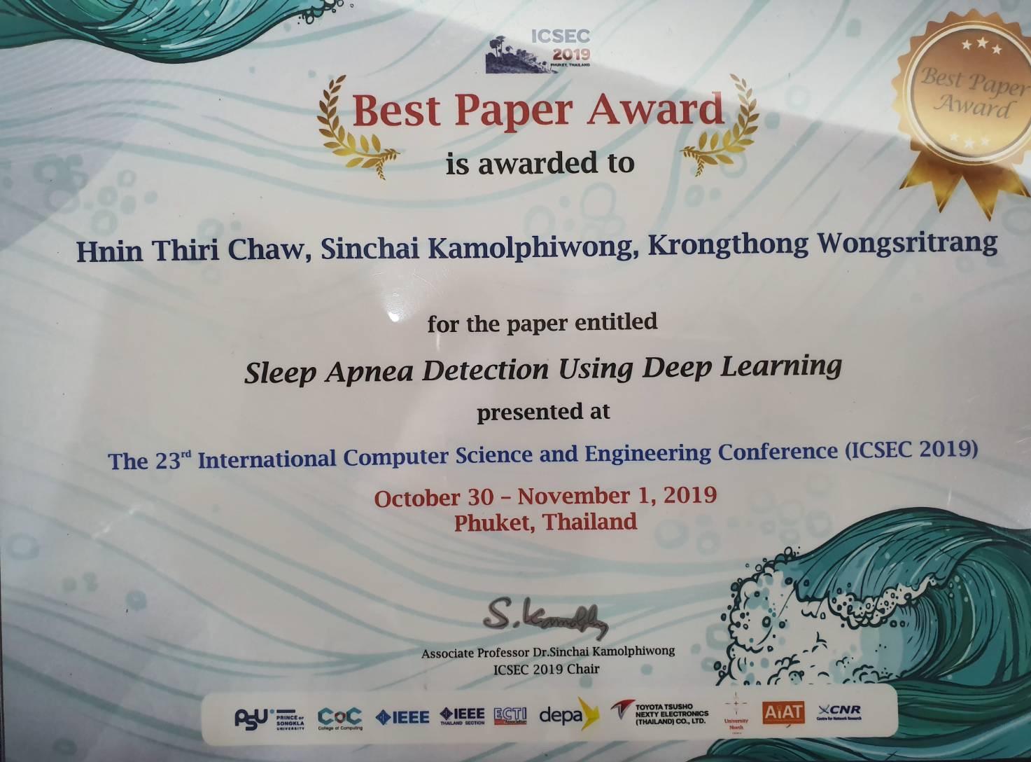 นักศึกษาระดับปริญญาเอก ภาควิชาวิศวกรรมคอมพิวเตอร์ Ms.Hnin Thiri Chaw นักศึกษาชาวต่างประเทศ ซึ่งได้ร่วมประชุมวิชาการ และ เสนอบทความวิชาการ เรื่อง "Sleep Apnea Detection Using Deep Learning" ซึ่งได้รับรางวัล Best Paper Award จากงานประชุมวิชาการ "The International Computer Science and Engineering Conference (ICSEC 2019)" ซึ่งจัดขึ้นระหว่างวันที่ 30 ตุลาคม - 1 พฤศจิกายน 2562 ทีผ่านมา ณ ป่าตอง จ.ภูเก็ต ประเทศไทย